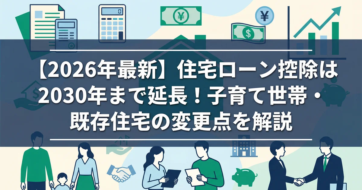 住宅ローン控除は、2026年(令和8年)入居分から2030年(令和12年)まで適用期限が延長される見込みです。2026年の変更点は、①省エネ性能の高い既存住宅のテコ入れ、②子育て世帯・若者夫婦世帯の借入限度額上乗せ、③床面積要件の緩和(40㎡)が中心です。