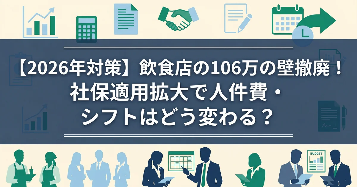 飲食店の「106万円の壁」撤廃とは、パート・アルバイトの社会保険(厚生年金・健康保険)加入に関して、いわゆる賃金要件(月額8.8万円以上)をなくす方向で制度が変わることを指します。厚労省は、企業規模要件の縮小・撤廃とあわせて、週20時間以上で働く短時間労働者の社会保険加入が広がる見通しを示しています。結果として、飲食店は「手取り」「人件費」「シフト設計」を同時に再設計する必要が出てきます。